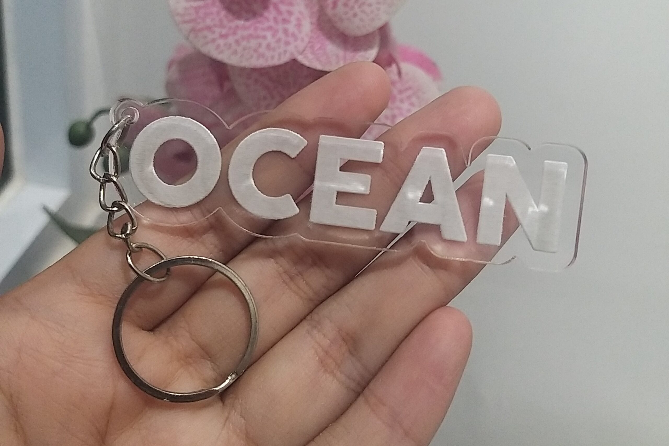 Akrilik bening memberikan kesan premium dan mewah. Transparansinya memungkinkan desain tulisan atau gambar terlihat jelas dan elegan. Dengan teknologi cutting atau engraving yang presisi, setiap detail nama atau logo yang dibuat pada gantungan kunci ini tampak rapi dan menawan.